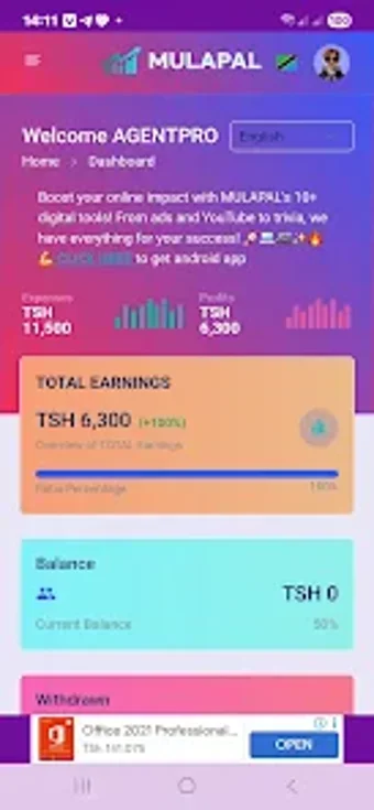 بالإضافة إلى وظائف الكسب، يوفر Mulapal Agencies أيضًا قسمًا للملف الشخصي لإدارة حساباتهم. يتضمن التطبيق ميزة "اتصل بنا" للدعم والوصول إلى كتب إلكترونية تجارية يمكن أن تعزز فهم المستخدمين لاستراتيجيات الكسب عبر الإنترنت. بشكل عام، يقدم هذا التطبيق نهجًا مباشرًا لتوليد الدخل من خلال أنشطة جذابة.